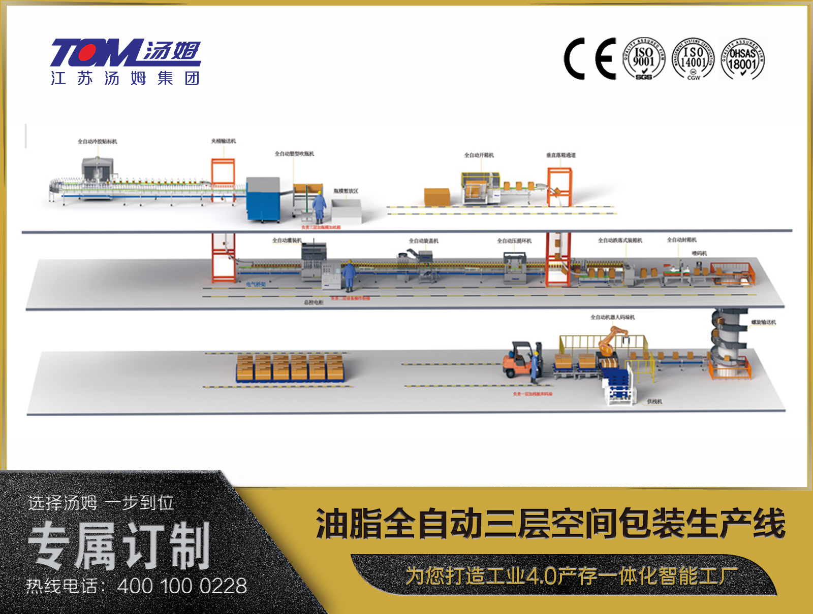 江蘇湯姆森智能裝備有限公司 是江蘇湯姆集團旗下全資子公司,坐落于常州市金壇區儒林鎮99號,是專(zhuān)業(yè)生產(chǎn)農化、日化、潤滑油、涂料、化工、調味品、鋰電新材料智能包裝裝備的廠(chǎng)家,工廠(chǎng)占地150畝,建筑面積120558㎡,擁有員工800多人,博士生2名,碩士研究生30名,本科358名,目前已取得ISO9001質(zhì)量體系認證、ISO14001環(huán)境管理體系認證、OHSAS18001職業(yè)健康安全體系認證、CE認證。26年來(lái),經(jīng)過(guò)湯姆人的艱苦奮斗,湯姆集團不斷創(chuàng )新發(fā)展、與時(shí)俱進(jìn),為4000多家企業(yè)提供了一代又一代先進(jìn)的智能包裝設備,為客戶(hù)打造工業(yè)4.0智能化工廠(chǎng);為客戶(hù)提供自動(dòng)化立體倉庫;為客戶(hù)創(chuàng )建智慧工廠(chǎng)生產(chǎn)數據采集執行系統(MES)。 了解更多>>